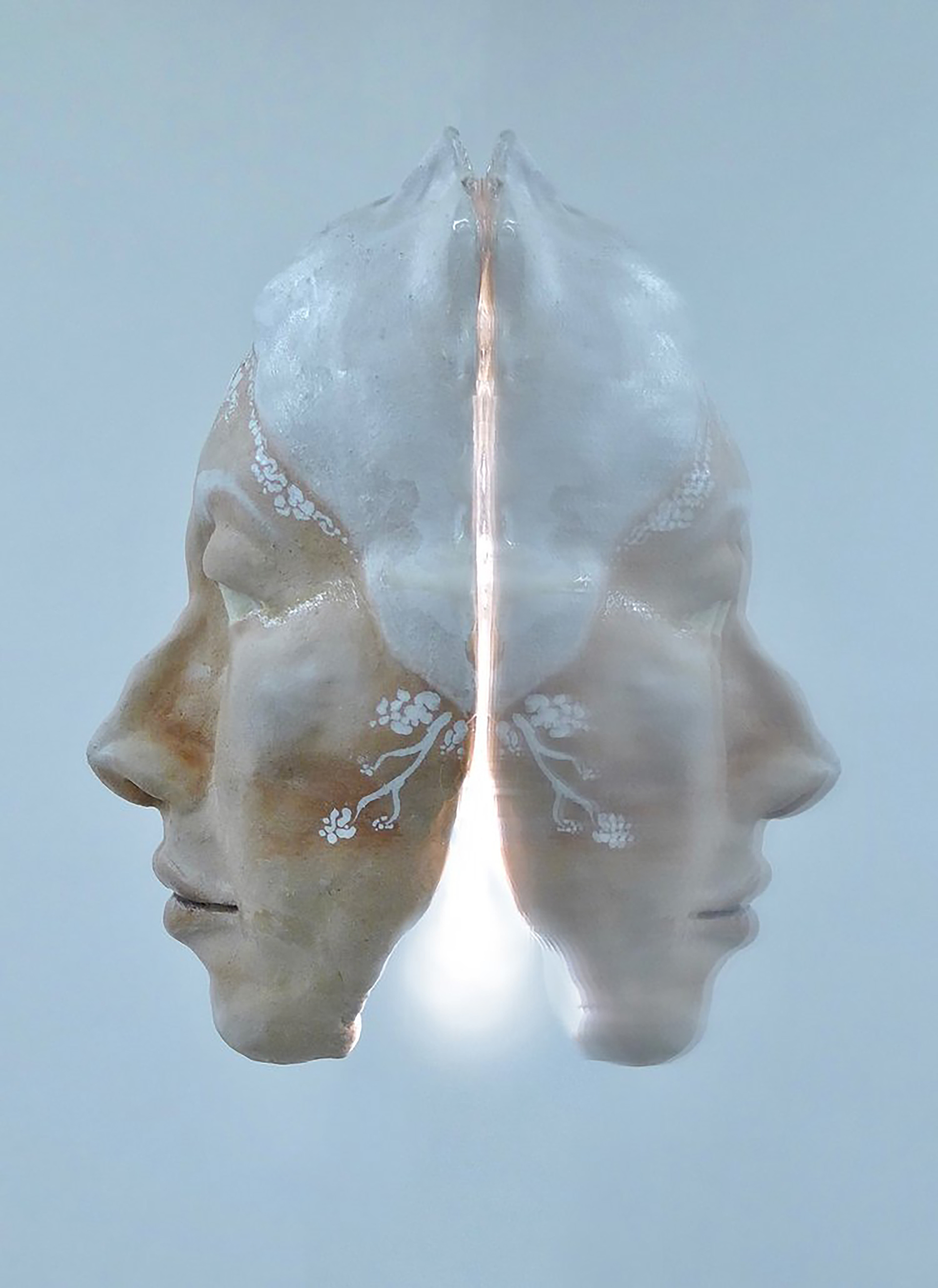 Annealed steel wire, rice paper, floral tape, gold leaf, paint, digital print on transparency