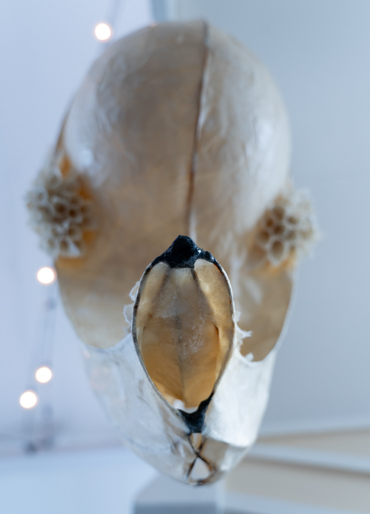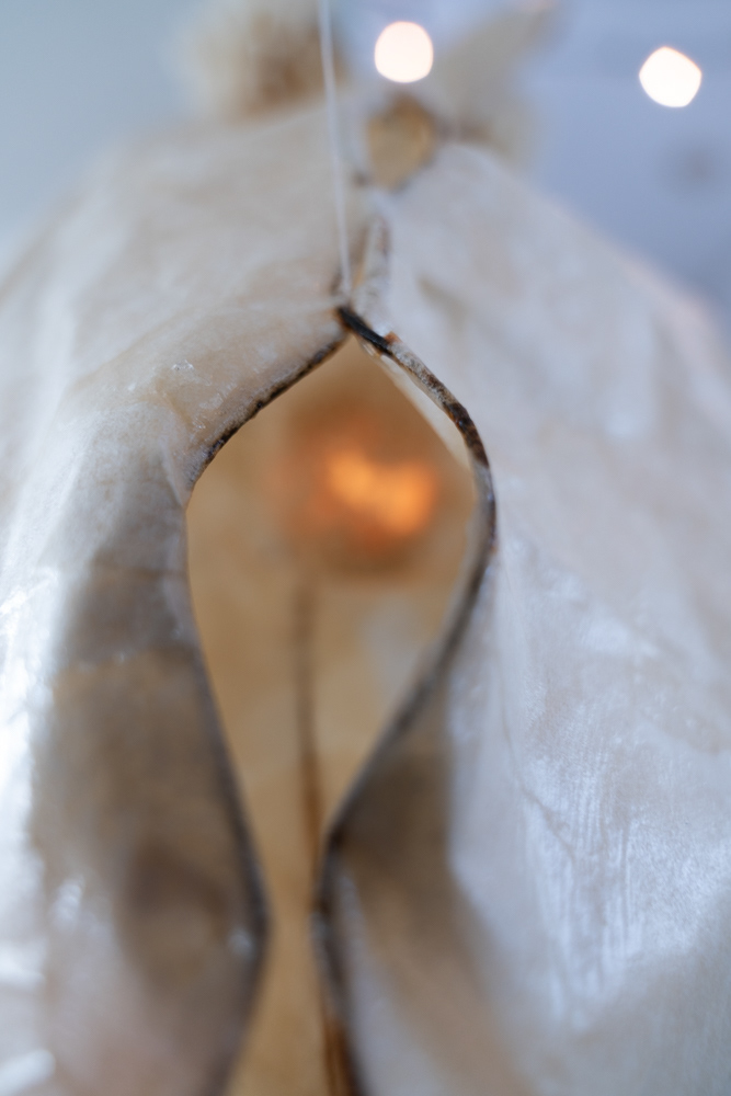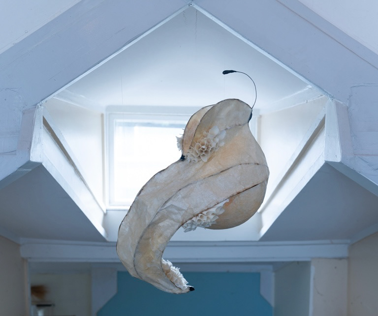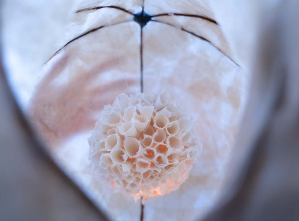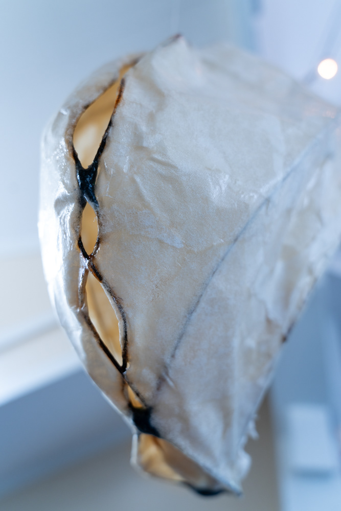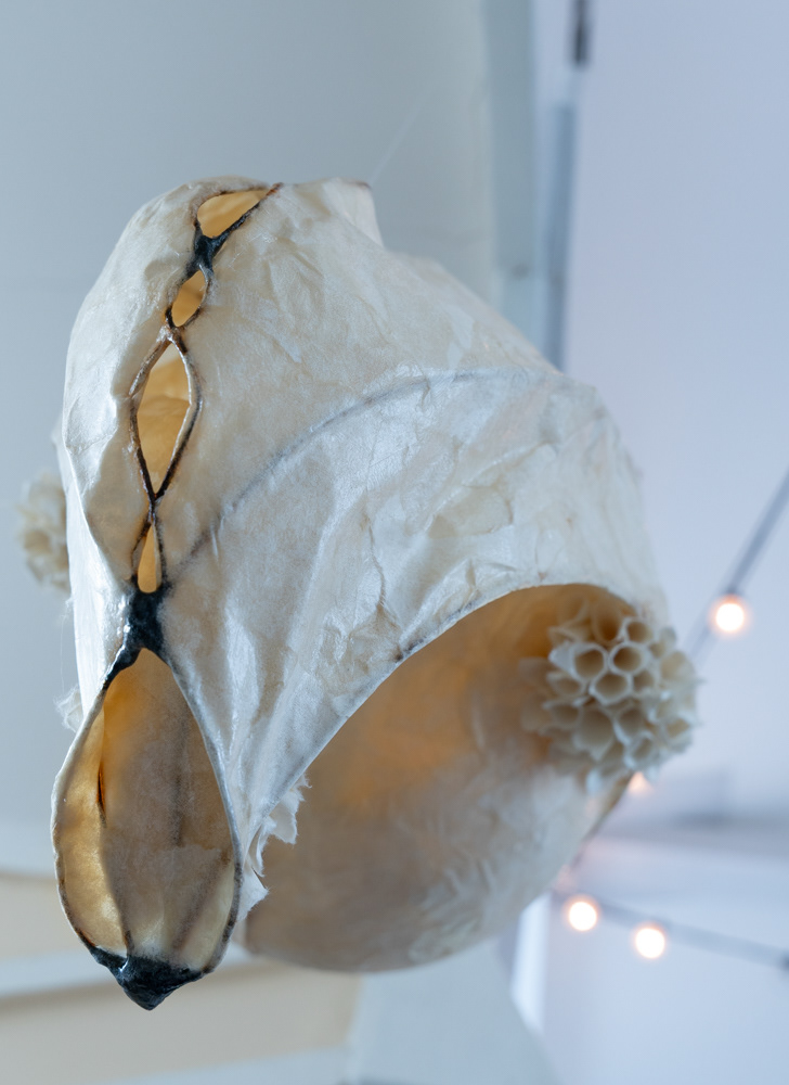 Rice Paper, wire, floral tape, plaster, gold leaf, LEDs, found form