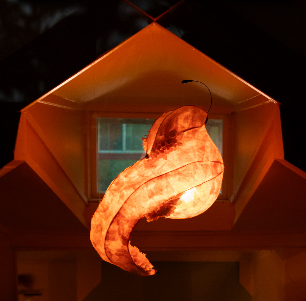 Annealed steel wire, rice paper, floral tape, gold leaf, paint, digital print on transparency